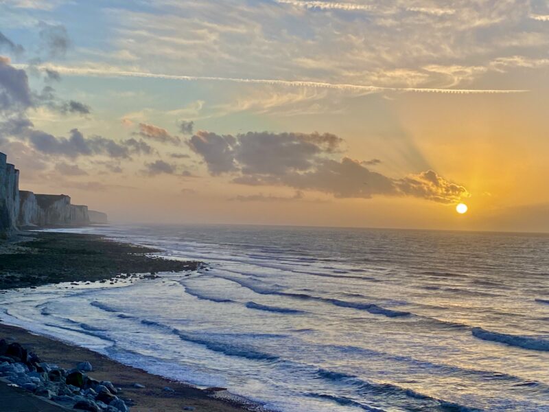 La réponse est: Charles-Nérée Beauchemin, (Là, un grand silence dans la foule), né le 20 février 1850 et mort le 29 juin 1931, c’est un poète québécois. Il s’est toujours revendiqué français (certain de ses poèmes sont d’un cocorico consternant) mais c’est bien un québécois. Ceux qui ont fait la promenade des falaises sur les hauteurs d’Ault (ci-dessous, un soir d’hiver) ont pu y lire quelques jolies strophes sur la mer. Il n’est pas Baudelaire ou Valéry. Mais c’est élégant.